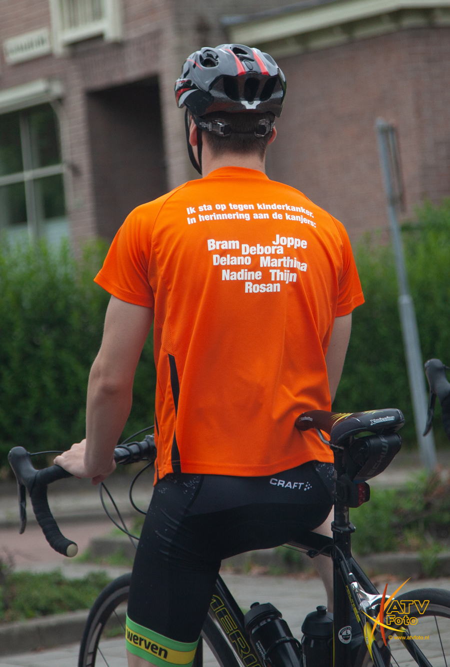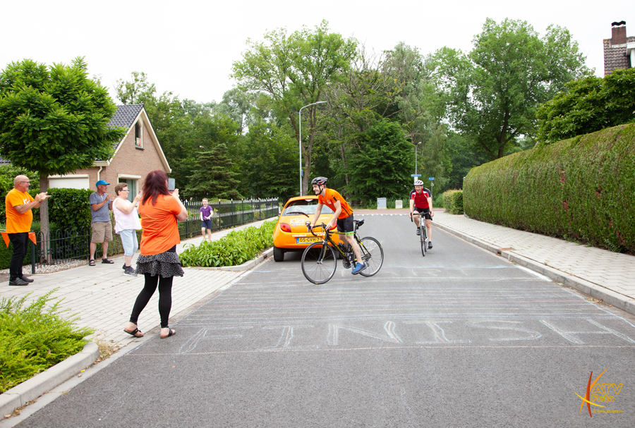 Zoals elk jaar gekleed in zijn oranje shirt met daarop de namen van de kinderen met wie hij tegelijk in het ziekenhuis lag, maar die er niet meer zijn. Stapte hij om 8.30u met zijn vader op de wielrenfiets en vertrokken ze voor de uitdaging. Henk Tablois van LOCO mediagroep interviewde hen en maakte een videoreportage. Na twee rondes werd er thuis geluncht en had moeder voor een broodje hamburger gezorgd. Net als in de Dellen tijdens de “echte” toer. Ook op de landelijke Radio werd er aandacht aan besteed, onderweg kreeg Jesse, Rob Jansen van 3FM aan de lijn. Corrine en Bennie uit Dedemsvaart waren in Oldebroek ter aanmoediging, zij verloren 10 jaar geleden hun 13 jarige dochter Debora.